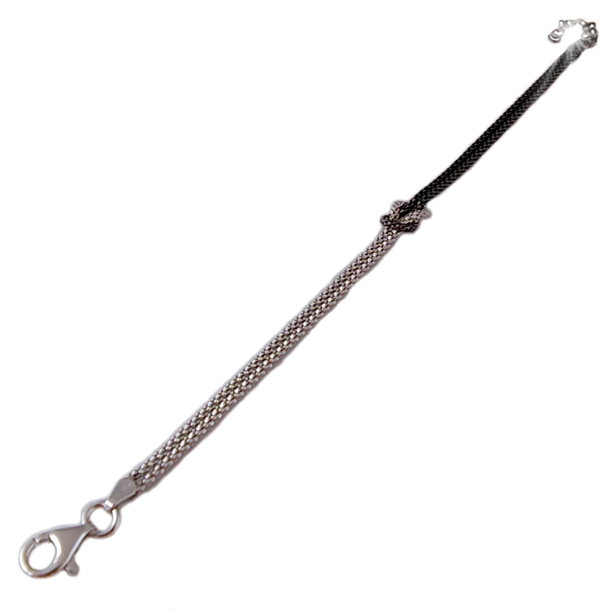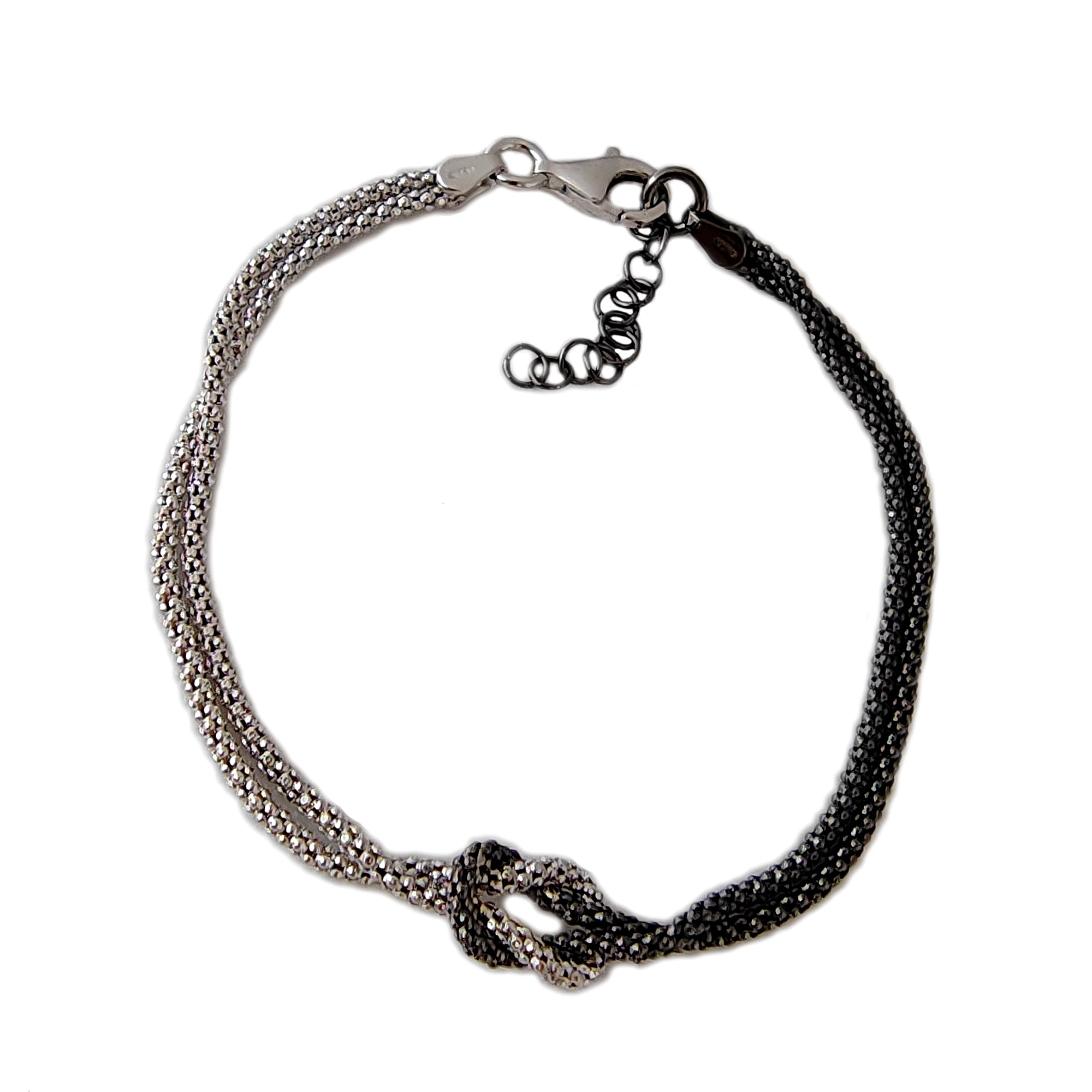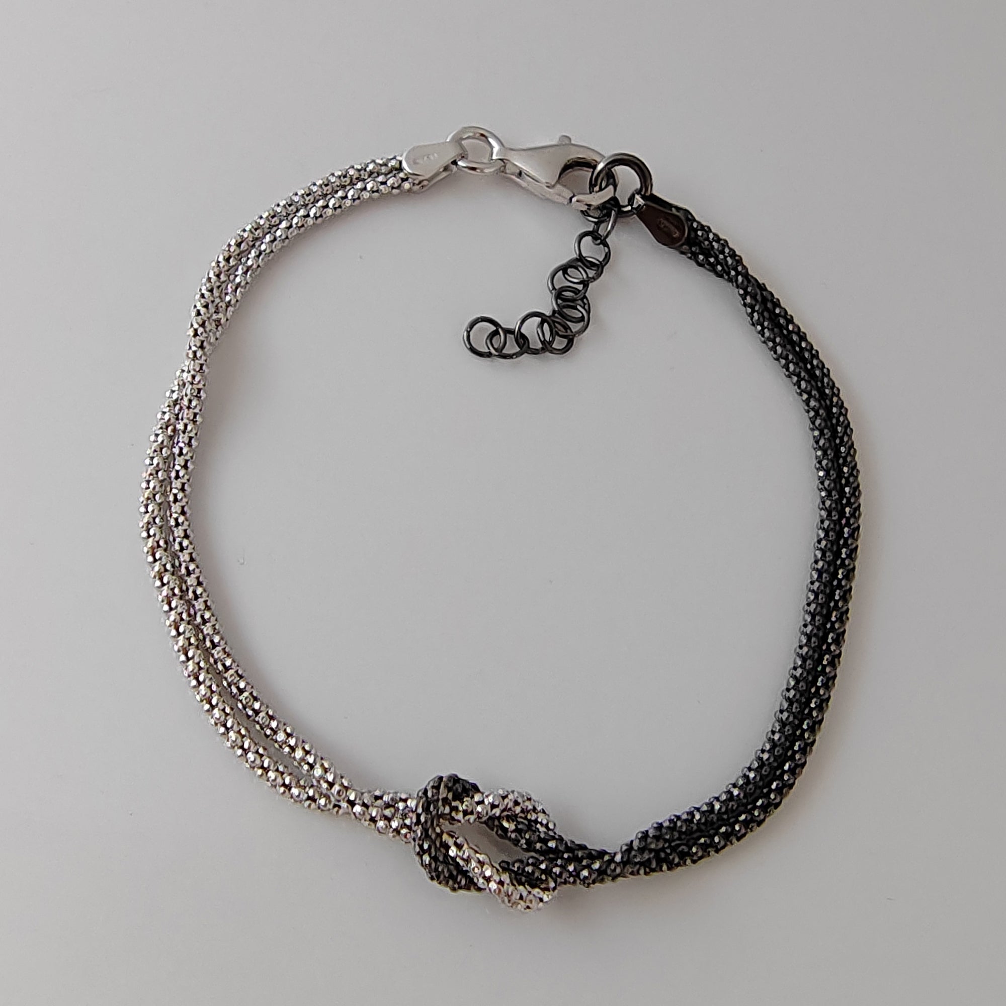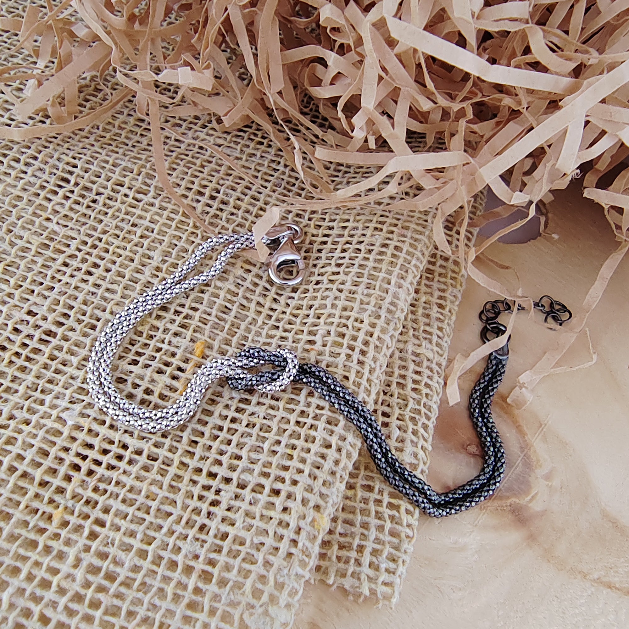 Realizzato a mano con cura artigianale, questo bracciale unisce due tonalità di argento in un elegante intreccio, simbolo di armonia e connessione.