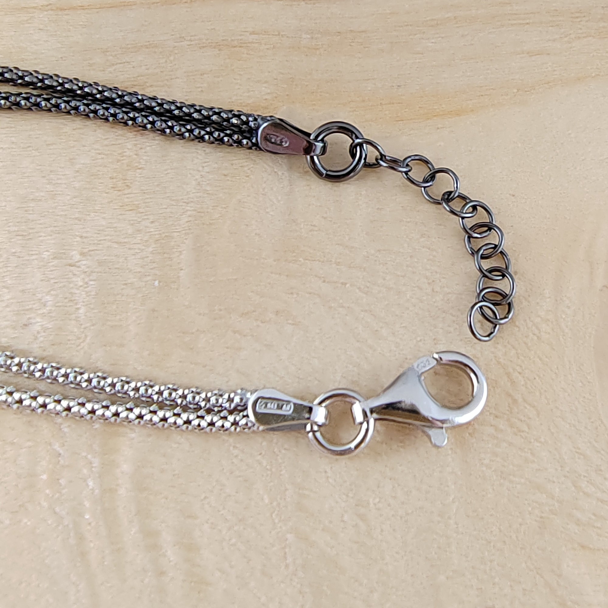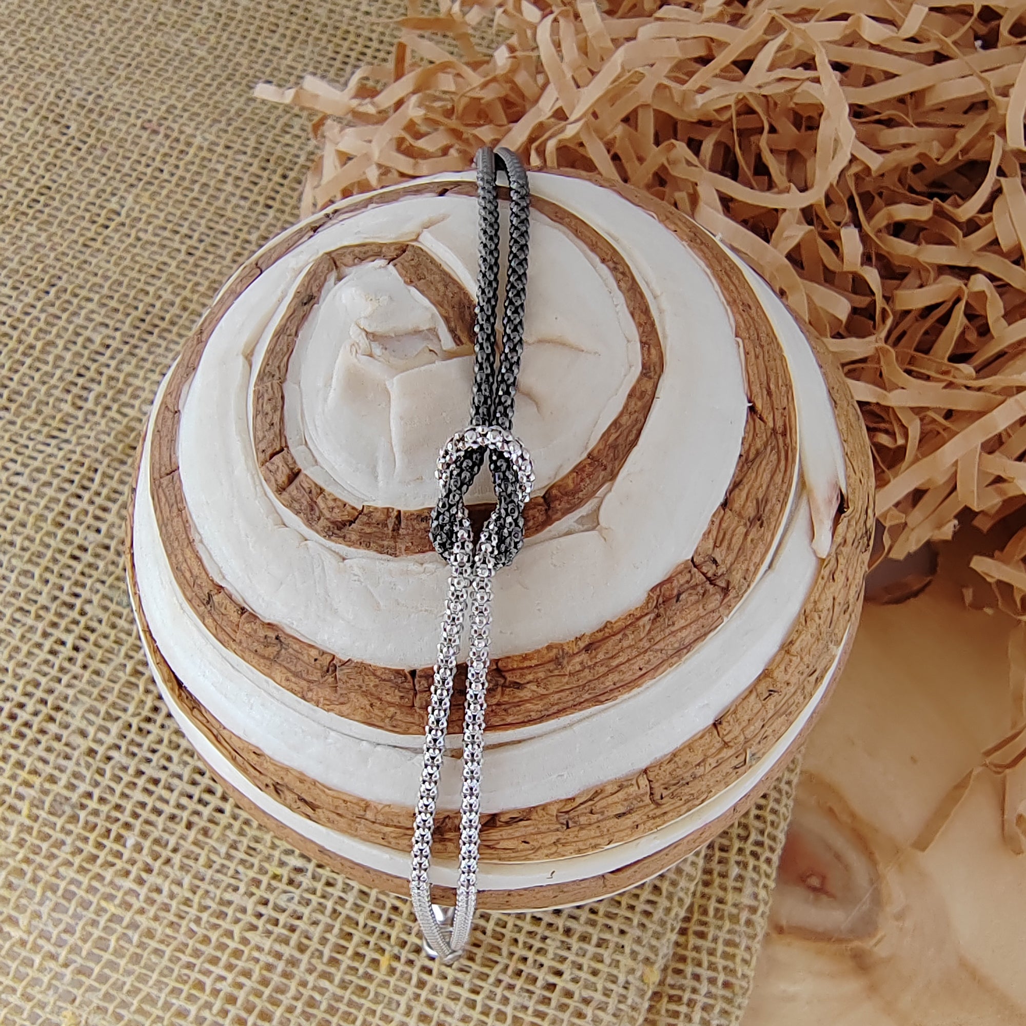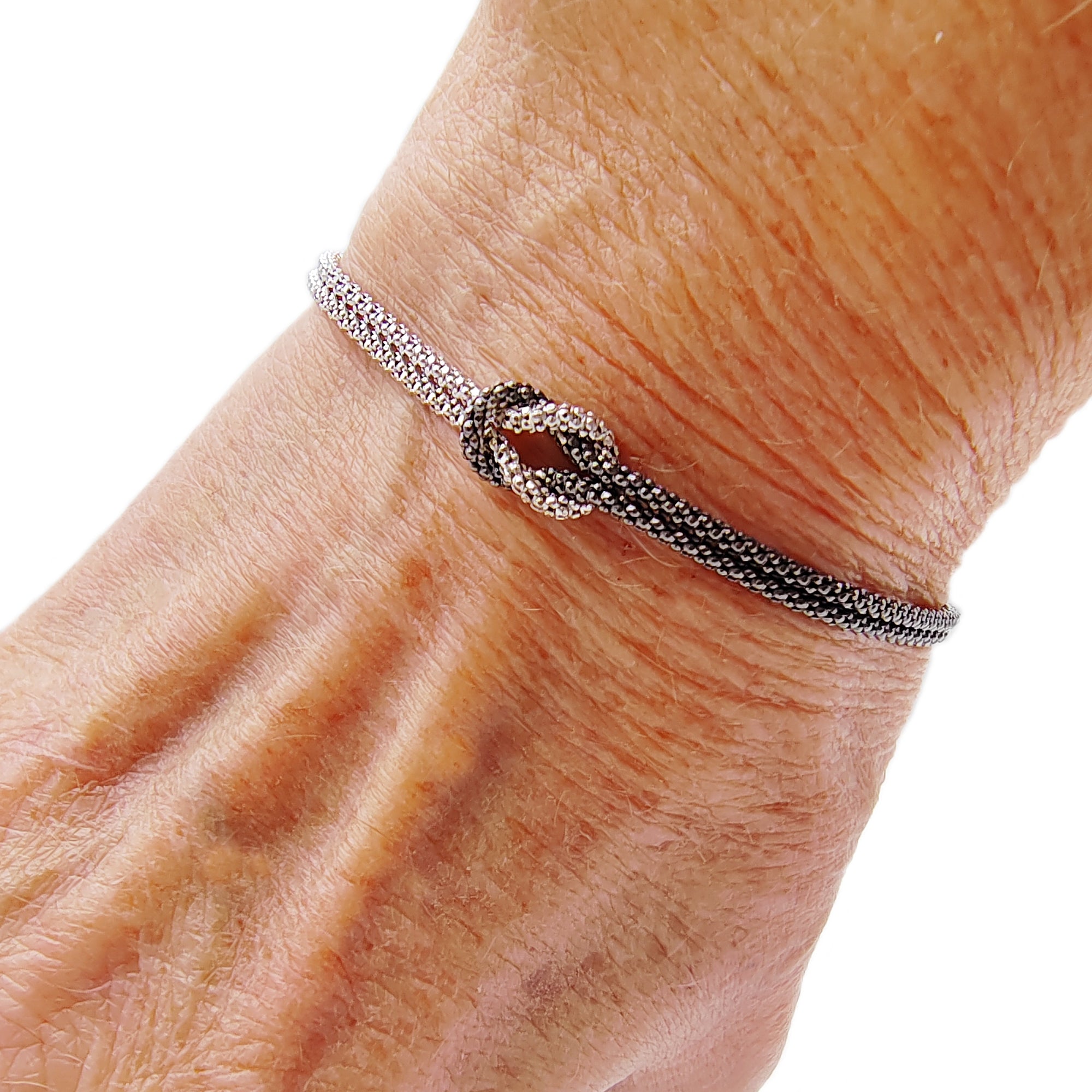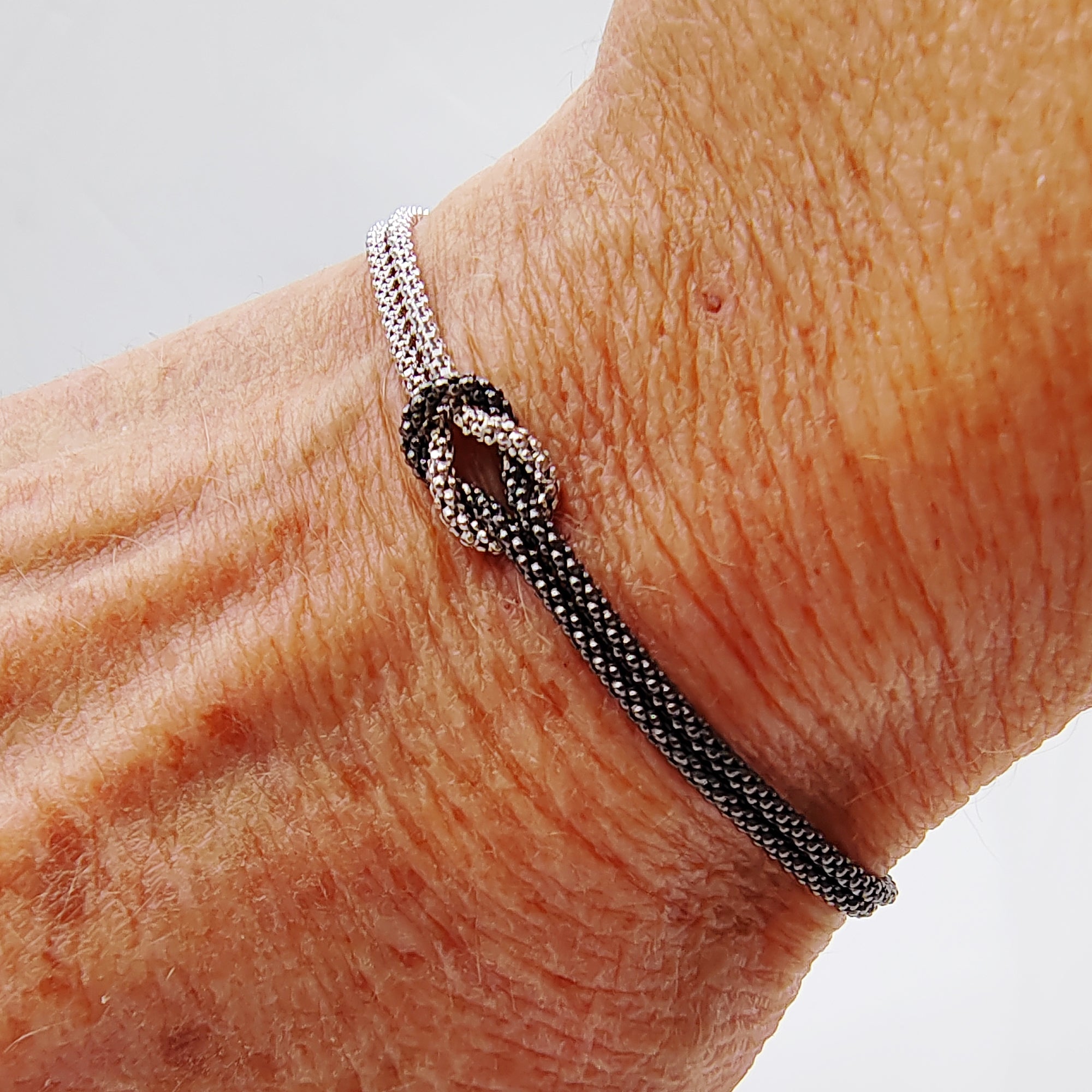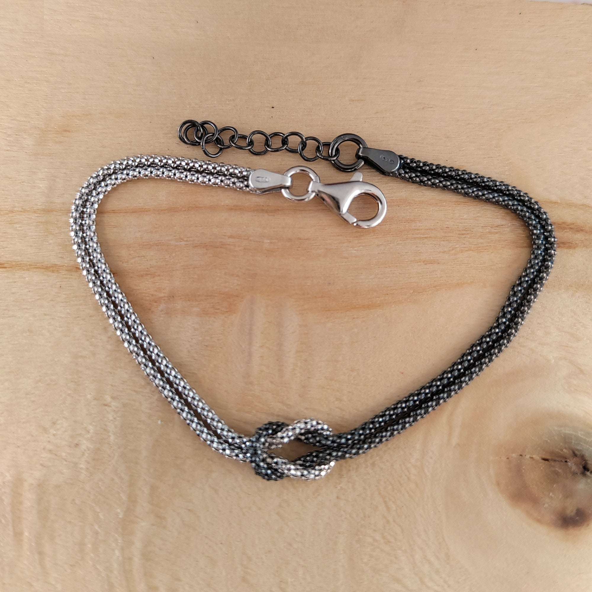 Realizzato a mano con cura artigianale, questo bracciale unisce due tonalità di argento in un elegante intreccio, simbolo di armonia e connessione.
